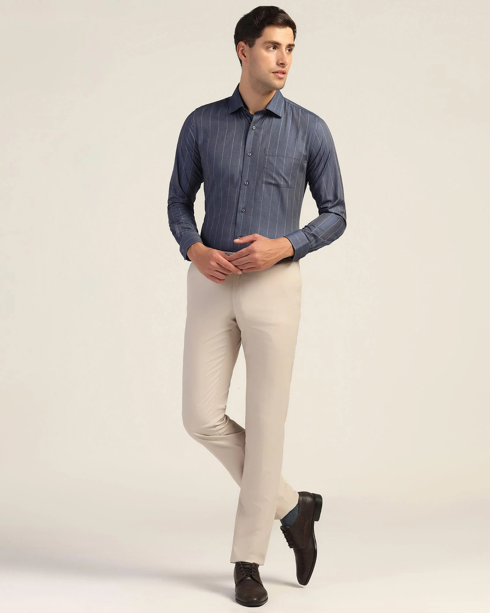 Indulge in the refined charm of this Navy Stripe Formal Shirt. Crafted from the finest Egyptian cotton sourced from the banks of the Nile, this formal shirt offers unmatched comfort. The India Fit design ensures a modern, tailored look, while the semi-cutaway collar adds a touch of elegance. The woven fabric showcases a classic stripe print, and the chest pocket adds a practical element to this refined piece.